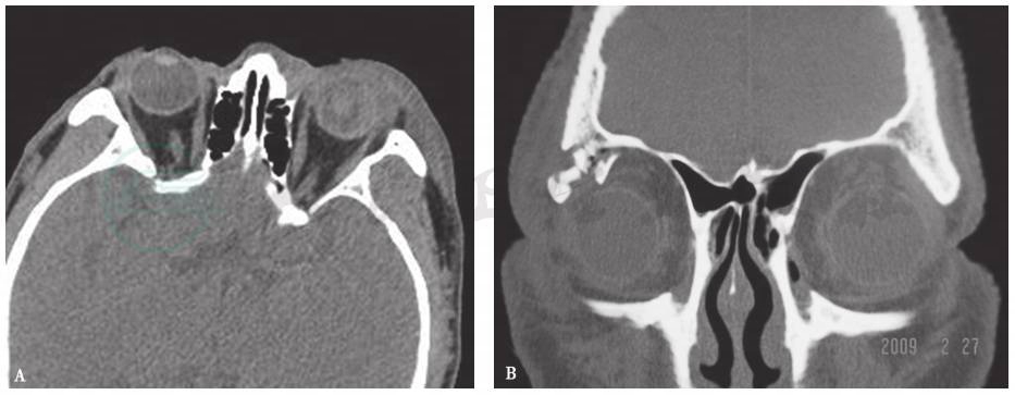 泪腺肿胀、轮廓不清、密度增高或不均匀,多伴有局部眼睑肿胀,有时可见碎骨片(图1)。