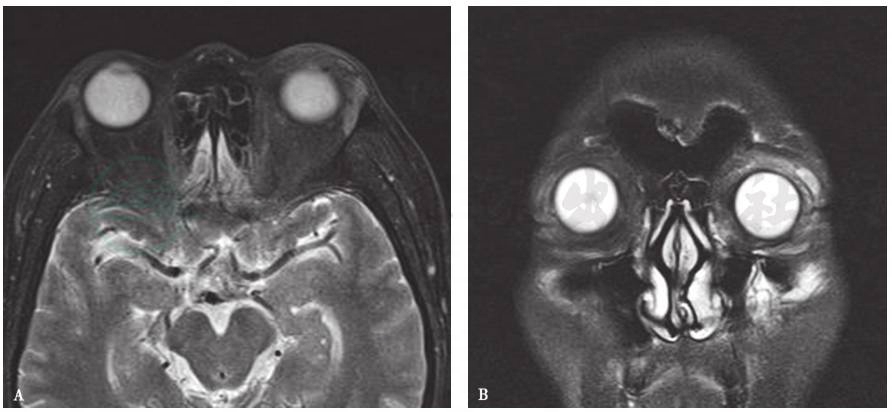 A、B.分别为横轴位、冠状位脂肪抑制T2WI图像:示左侧泪腺体积增大、呈高信号,左眼睑软组织增厚、信号增高一般很少见有单纯泪腺外伤,多为眼睑外伤、外上方眶缘骨折合并泪腺外伤。泪腺外伤X线平片不能显示。