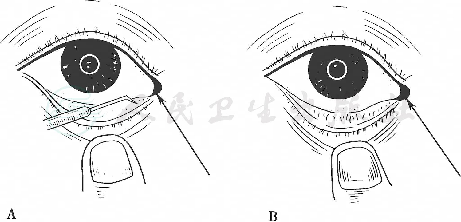 A.烧灼器定位在泪点下方;B.泪点向内转位