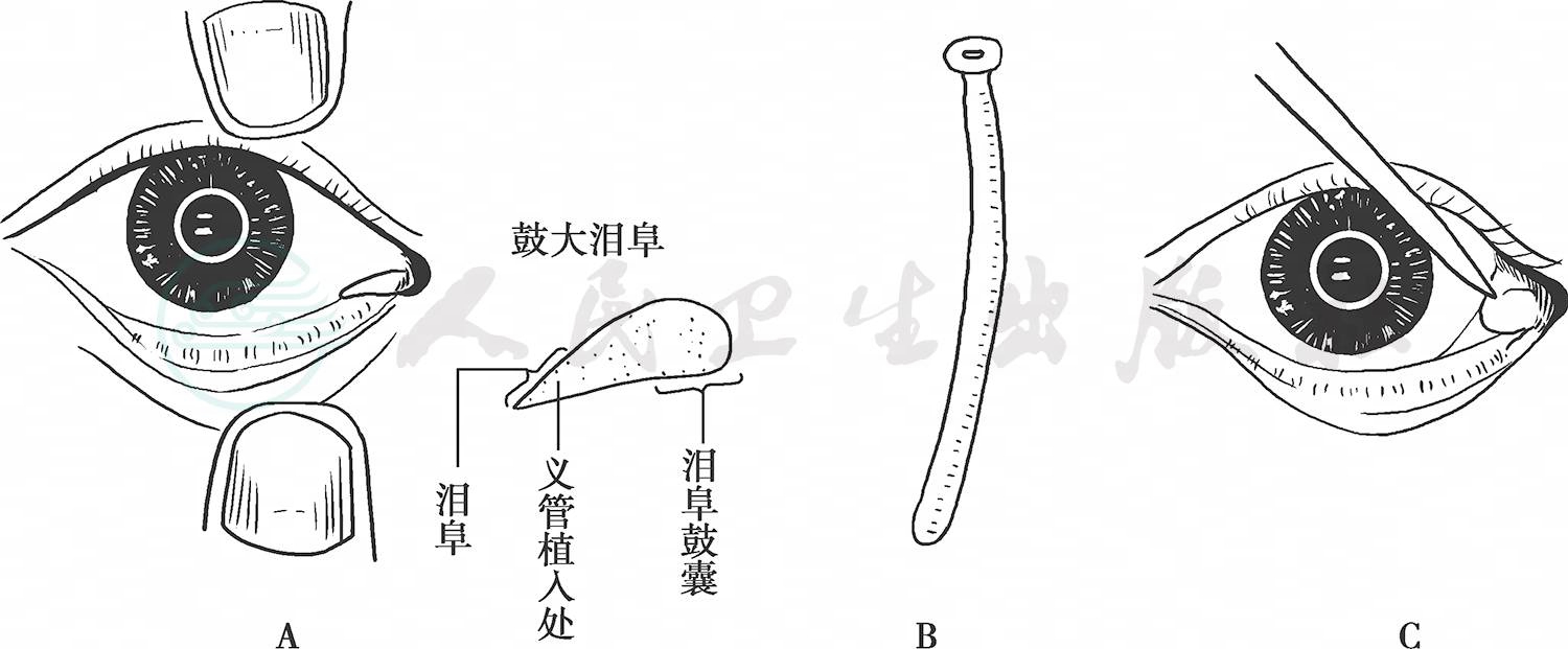 泪小管和泪囊结构严重损毁而无法修复者,则行泪道义管术。