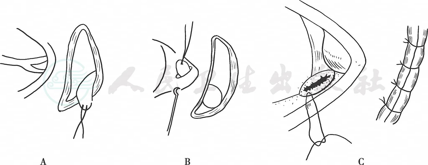 伤后阻塞部位距泪点6mm 以内者,则可行泪小管吻合术。①局部浸润麻醉;②探查泪道;③切除瘢痕;④对位吻合。