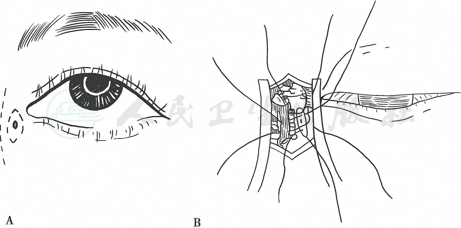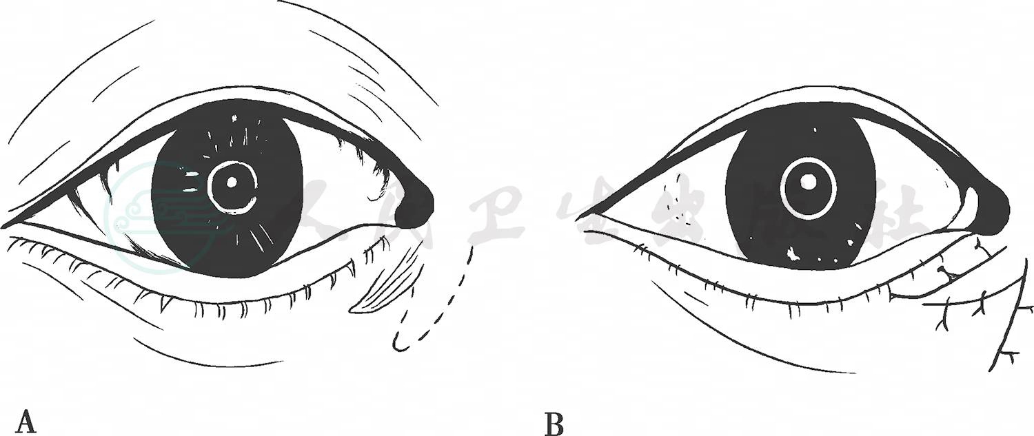 适用于下睑内侧瘢痕牵引而引起的下泪点外翻伴溢泪者。局麻或全麻,在内眦瘢痕处切开,分离松解瘢痕并切除,做“Z”形皮瓣,将皮瓣交叉错位缝合(图5)。