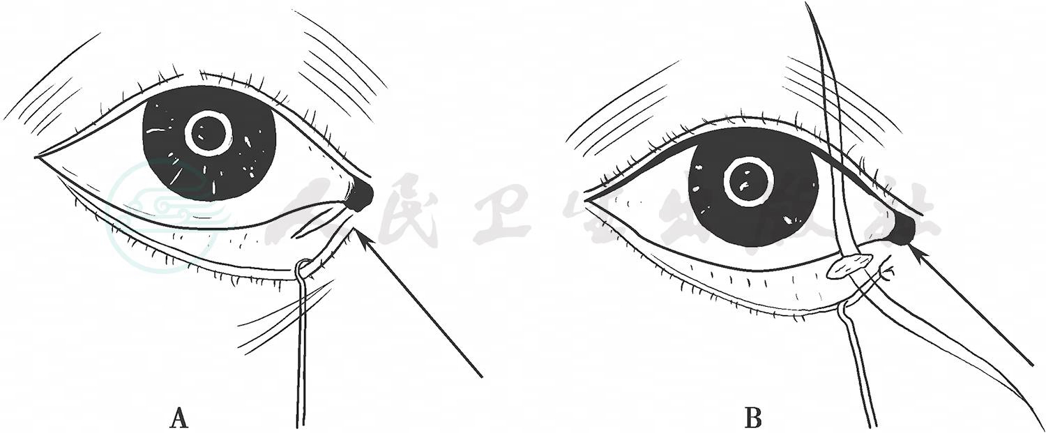 在手术显微镜下以8-0缝线将撕裂的泪点周围组织对位缝合,泪点和泪道内可置入硅胶管(silicone duct)作为支撑物(stent)。