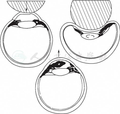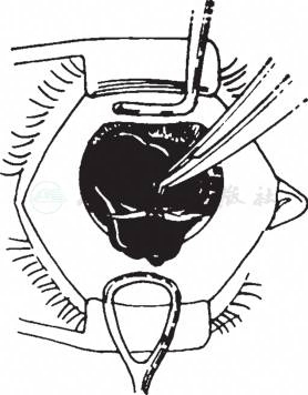 有研究认为,对前房积血超过4天,凝血块已牢固地凝缩在前房,单纯冲洗不易除去,此时可按白内障手术方式作切口清除前房积血。术前软化眼球,使眼压降低。在12点位作一角膜大切口长达120°~160°,在6点位角膜缘内轻轻按摩,将凝血块排出(图6)。应当注意此时凝血块与虹膜不易鉴别,而且易与虹膜及晶状体粘连,手术时要特别小心。也可配合前房冲洗,周边虹膜切除术(peripheral iridectomy)。缺点是切口波及角膜结构,影响以后进行滤过性手术(filtration surgery),此外有可能带出粘连的葡萄膜组织、晶状体或玻璃体。