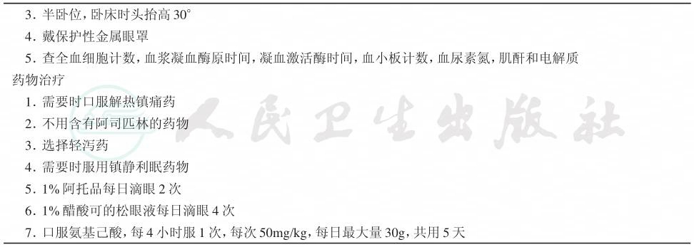 受伤早期应予半卧位,抬高床头30°,促使血液下沉,限制眼球运动,可洗澡。防止便秘和剧烈咳嗽,避免对眼球施加压力,禁止弯腰和抬重物。以金属或透明塑料眼罩全天遮盖患眼。不可包扎,以便及时发现再次出血造成的视力丧失。