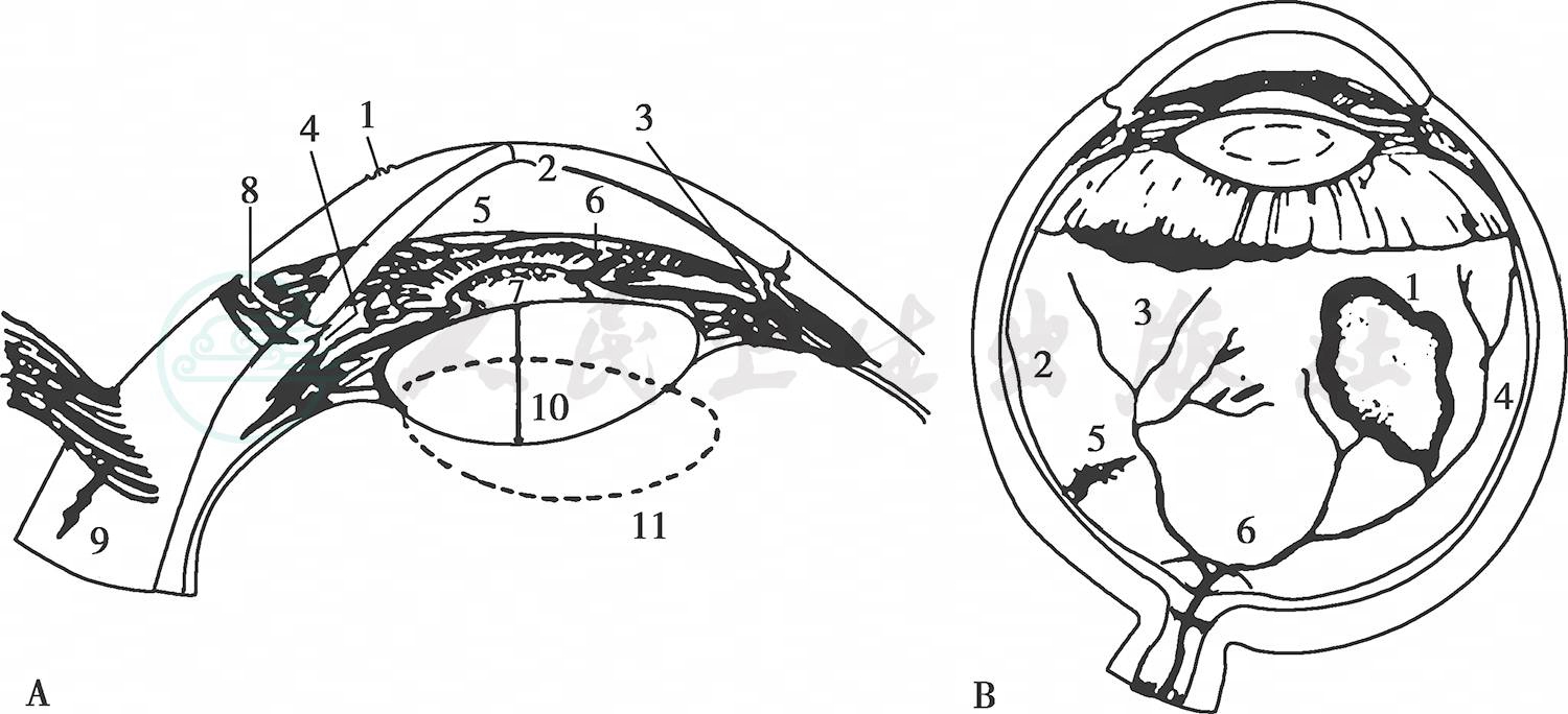 A.1:角膜擦伤;2:角膜内皮细胞损伤,可伴角膜血染;3:前房角后退;4:睫状体分离;5:虹膜根部断离;6:虹膜括约肌破裂;7:晶状体前囊Vossius环;8:角巩膜破裂;9:巩膜破裂;10:白内障;11:晶状体不全脱位;B.1:玻璃体积血;2:视网膜水肿;3:视网膜锯齿缘截离;4:视网膜裂孔;5:脉络膜破裂;6:视神经损伤