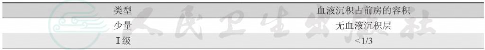 外伤性前房积血的根据积血量分为少量及1~4级。少量出血是指前房内只存在循环的血液而无凝血块(表1,图2。)