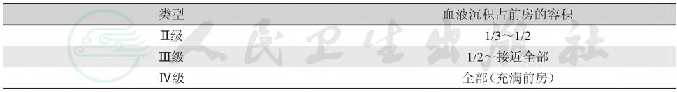 急性期(1~7 天)、亚急性期(8~14 天)和慢性期(>14天)。受伤时立即发生的前房积血为原发性前房积血,受伤后2~5天发生的前房积血为继发性前房积血。