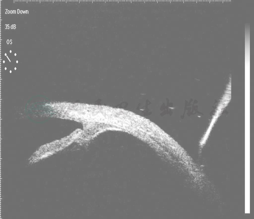 外伤性前房积血相关的眼球前段改变最重要的是前房角后退(recession of anterior chamber angle),一般发生于挫伤所致的闭合性眼外伤,表现为睫状肌纵行肌和环形肌之间分离(图4)。前房角后退的范围与前房积血的量或急性眼压升高并不一定相关。前房角后退发生前房积血者占30%~85%,早期或后期出现的青光眼与此有关。较广泛的前房角后退常伴有高发生率的迟发性青光眼,前房积血患者有6%~10%发生前房角后退性青光眼。睫状体从巩膜突上分离造成睫状体断离,很少发生前房积血,而睫状体断离是低眼压的重要原因。