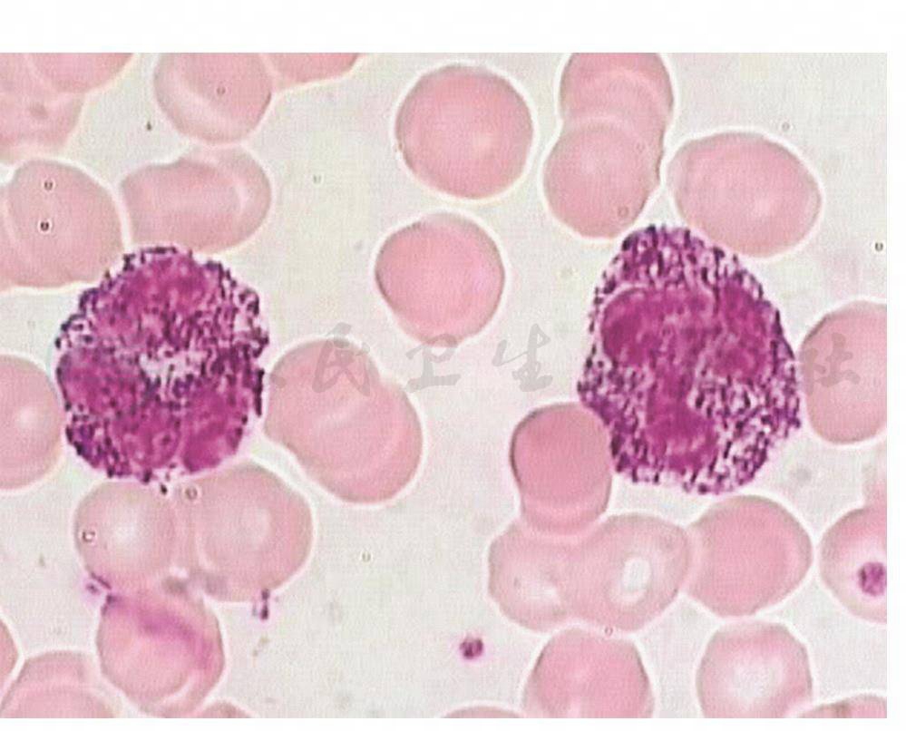 中性粒细胞中含有巨大深染的嗜天青颗粒,染深紫色。该颗粒与中毒颗粒的区别是颗粒较大,不伴有白细胞数量增高、核左移和空泡变性等毒性改变(图1、2)。