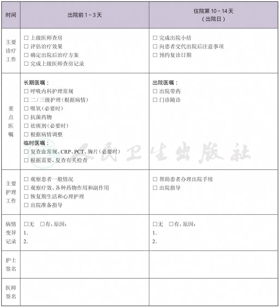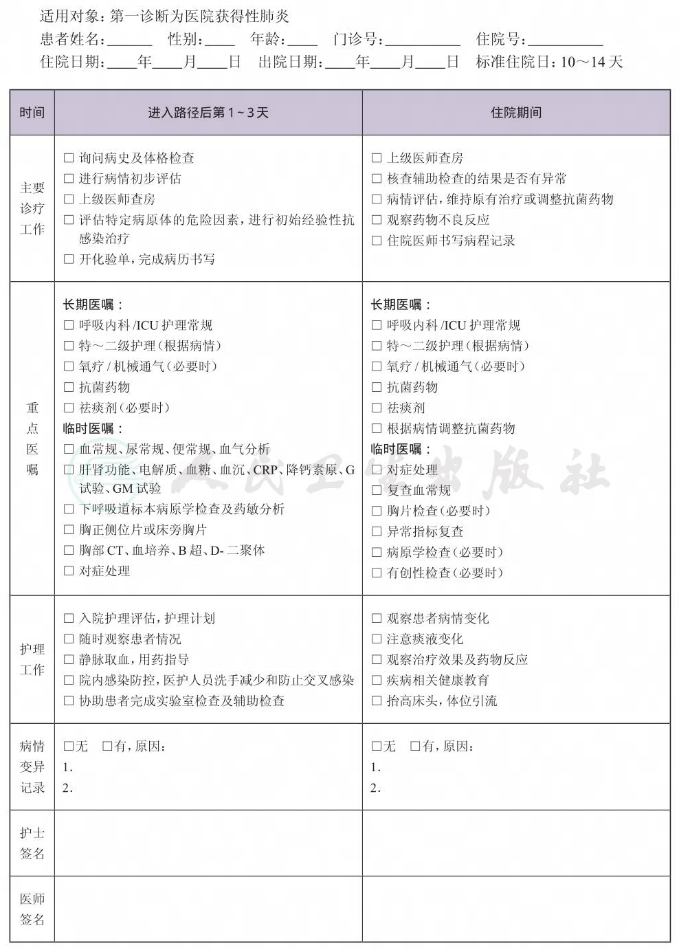 二、 医院获得性肺炎临床路径表单